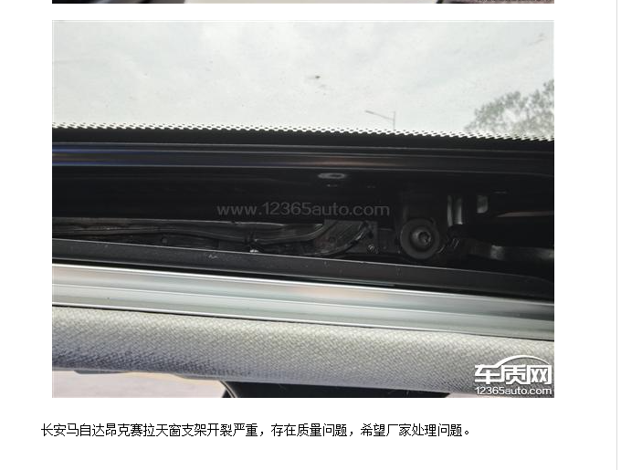 长安马自达昂克赛拉天窗滑轨两侧塑料件开裂,正常用车没有想到会有这样的问题!从关注车质网中了解到有不少车友反馈,希望厂家能够重视处理。