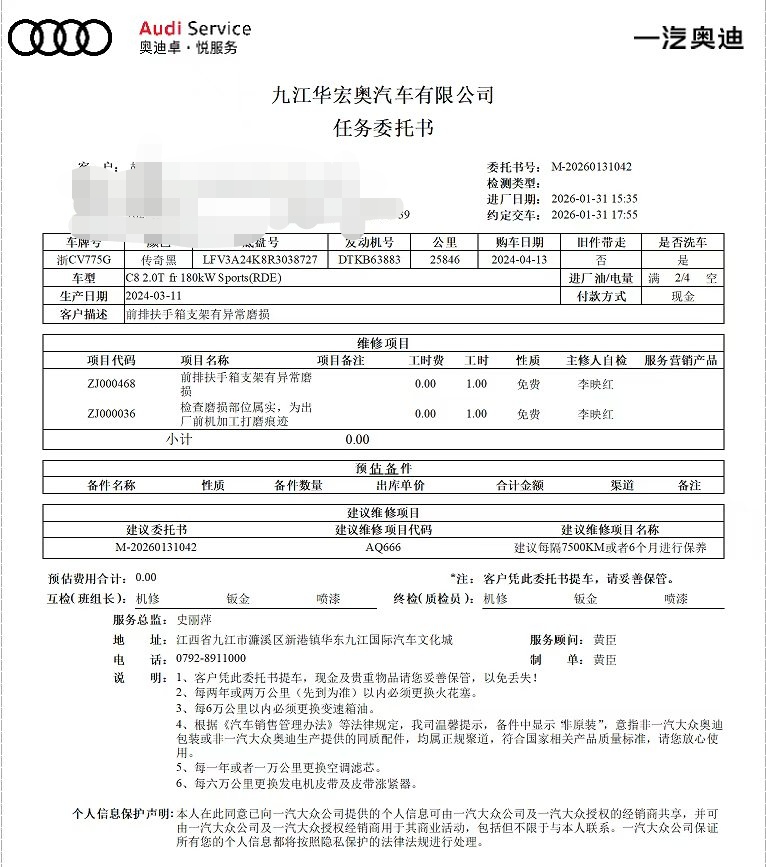 浙江省汽车销售服务有限公司涉嫌欺诈消费者的事件。该公司在新车销售时,销售了一辆含有劣质旧配件的新车给我们,涉嫌欺诈消费者。现该销售公司负责人推脱责任不愿意做检测,不愿意赔偿,我们要求奥迪总部调查此事,以保护消费者的权益。各位车友注意,当心你们买的新车是次品旧,图片是24款a6l45,扶手箱钢架,因为不小心把硬币弄到扶手箱盖子里面,打开塑胶底板看到整个钢架磨损非常严重一看就是旧件。现在九江奥迪店检测结果如下,奥迪公司目前还没主动联系我