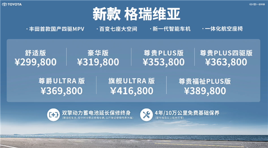 4月18日,车质网从官网获悉,2024款一汽丰田格瑞维亚正式上市,新车推出7款车型,售价区间29.98-41.68万元。作为年度改款车型,新车针对配置层面进行调整,增加和改进了多项配置,进一步提升竞争力。同时新车还首次搭载了E-Four四驱系统。