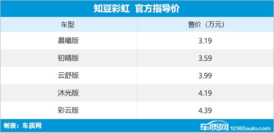 4月18日,知豆彩虹正式上市,新车共推出5款配置,售价区间为3.19-4.39万元,补贴后售2.79-3.99万元。新车提供了灵动可爱的造型设计,配置偏基础。