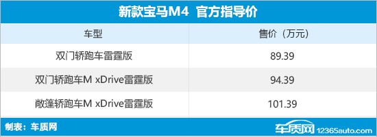 4月19日,新款宝马M4双门/敞篷轿跑车正式上市,包含双门轿跑车雷霆版、双门轿跑车M xDrive雷霆版和敞篷轿跑车M xDrive雷霆版三款车型,建议零售价分别为89.39万元、94.39万元和101.39万元。