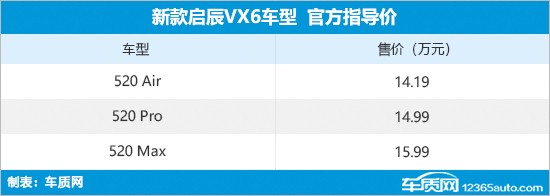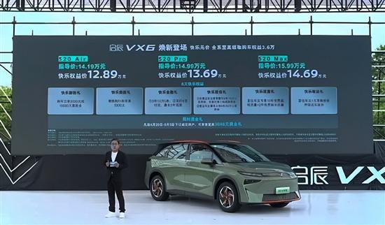 4月20日,新款启辰VX6正式上市,共推出3款配置车型,售价区间为14.19-15.99万元。官方表示,新车限时快乐权益价格区间为12.89-14.69万元。除了全新配色,“不焦绿”版车型还针对配置方面进行了优化升级,使其更具性价比。
