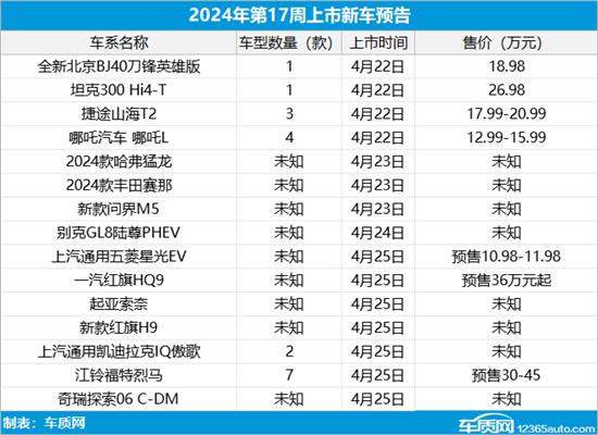 2024年第17周(4月22日-4月28日)上市新车预告