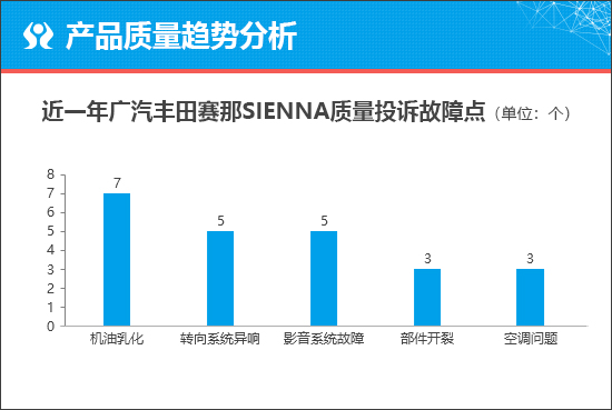 通过对广汽丰田赛那车型近一年的投诉数据分析可以发现,故障问题比较分散,其中包括“机油乳化”、“转向系统异响”以及“影音系统故障”等,不过投诉故障点均为个位数。考虑到新款广汽丰田赛那是改款车型,并搭载THS II第四代2.5L大容量混合动力系统,因此可暂且认为其出现上述问题的几率较低,具体情况如何,还要待其使用一段时间后才能有定论。