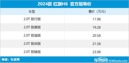 6月14日,2024款红旗H6正式上市,新车推出5款车型,售价区间17.98-23.98万元。新车全系增加了一款入门版车型,使得售价区间进一步降低,同时还在配置方面进行了优化升级。
