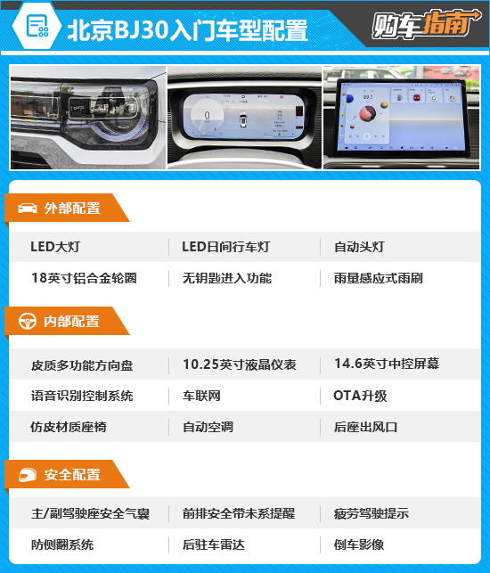 2024款北京BJ30入门版车型为1.5T 轻野Air版,售价9.99万元。配置方面,虽然包括多功能方向盘、10.25英寸液晶仪表以及14.6英寸中控屏均为全系标配,但是由于缺少了部分实用性和安全性配置,因此性价比表现确实比较一般,并不值得推荐。
