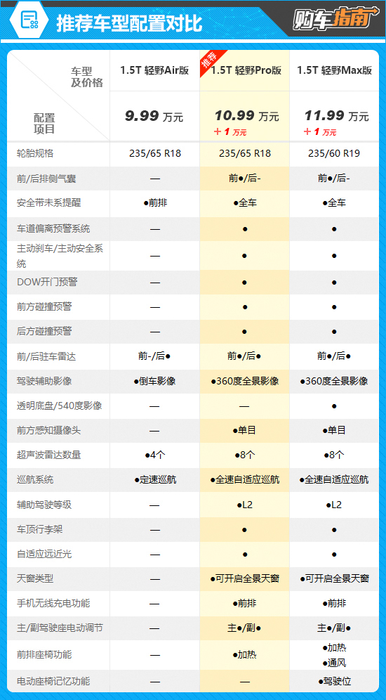 综上所述,还是售价10.99万元的1.5T 轻野Pro版性价比最高,消费者在选购时可以优先考虑。