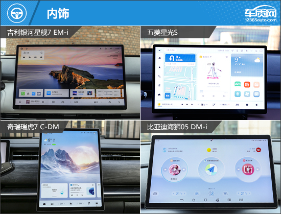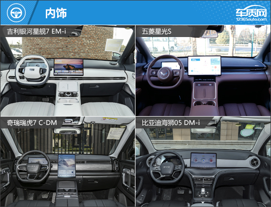 外观方面,星舰7 EM-i和五菱星光S的前脸样式有着时下新能源车流行的设计风格,而瑞虎7 C-DM和海狮05 DM-i则更类似传统燃油车。同时,瑞虎7 C-DM采用了更为硬朗的造型,与其他三款主打时尚的车型相比,独树一帜。车尾部分,除了五菱星光S之外,其余三款车型均融入了贯穿式设计,符合时下主流。值得一提的是,五菱星光S的牌照架位于后备厢盖下方,进而强化了车尾的整体感。
