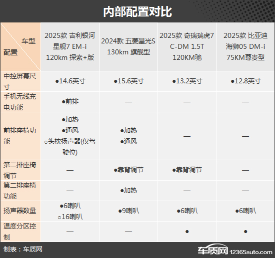 内部配置方面,银河星舰7 EM-i和五菱星光S的表现相对较好,前者独享前排手机无线充电,后者则对后排乘客照顾更周到,提供了后排座椅加热功能。相比之下,海狮05 DM-i的配置就有些不够看了,表现垫底。