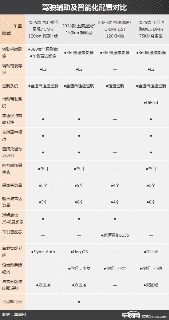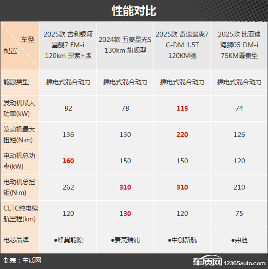 此次推荐的四款车型均为自主品牌插混紧凑型SUV,分别为2025款吉利银河星舰7 EM-i 120km探索+版(以下简称星舰7 EM-i)、2024款五菱星光S 130km旗舰型(以下简称五菱星光S)、2025款奇瑞瑞虎7 C-DM 1.5T 120KM驰(以下简称瑞虎7 C-DM)和2025款比亚迪海狮05 DM-i 75KM尊贵型(以下简称海狮05 DM-i)。本文将尽可能选取四款车型中价格相近的车款进行对比,看看它们表现如何。