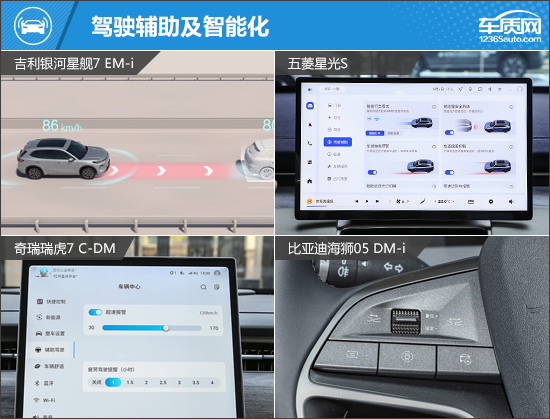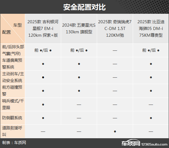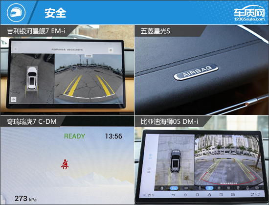 安全配置方面,银河星舰7 EM-i不仅在四款车中独享哨兵模式/千里眼功能,并且还与海狮05 DM-i一样提供了防侧翻系统,整体表现是四款车中最为出色的。瑞虎7 C-DM由于是全系最低配车型,所以安全配置有所缺失,与另外三款车型差距明显。