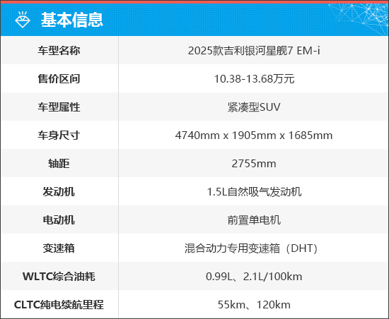 吉利银河星舰7 EM-i基于GEA新能源专属架构打造,并首次搭载雷神EM-i超级电混系统,由1.5L自然吸气发动机和前置单电机组成。其中,发动机最大功率82kW,最大扭矩136N·m,热效率高达46.5%。电动机总功率160kW,总扭矩262N·m,传动系统匹配混合动力专用变速箱。CLTC纯电续航里程根据车型配置不同有所差异,分为55km和120km两个版本,官方公布的CLTC最低荷电状态油耗仅为3.75L/100km。