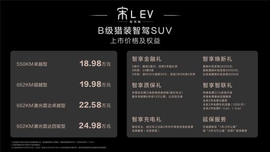 宋L EV智驾版以“加配不加价”的方式,全系标配高阶智驾,更将激光雷达等高端配置普及化,带来智能化体验的价值飞跃,真正开启了全面高阶智驾新时代。同时,其拥有极致舒享的智能座舱、媲美豪华跑车的先锋设计,以及e平台3.0、云辇-C带来的极致操控,不仅颠覆了传统SUV的驾乘体验,更重新定义了B级猎装智驾SUV的价值标杆,成为比亚迪在高阶智驾领域的一张闪亮名片,为用户带来超越期待的高品质出行体验。