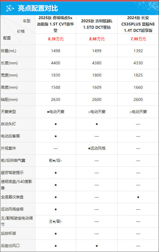 价格方面,2025款奇瑞瑞虎5x高能版的起售价是三款车型中最低的,仅为6.99万,消费者购车成本更低。相比之下,2025款吉利缤越L的起售价最高,达到8.98万。车型数量上,2025款奇瑞瑞虎5x高能版依旧表现出色,提供了3款车型可选,2025款吉利缤越L紧随其后,提供2款车型,而2024款长安CS35PLUS仅提供了1款车型,综合来看,2025款奇瑞瑞虎5x高能版占有一定的优势。