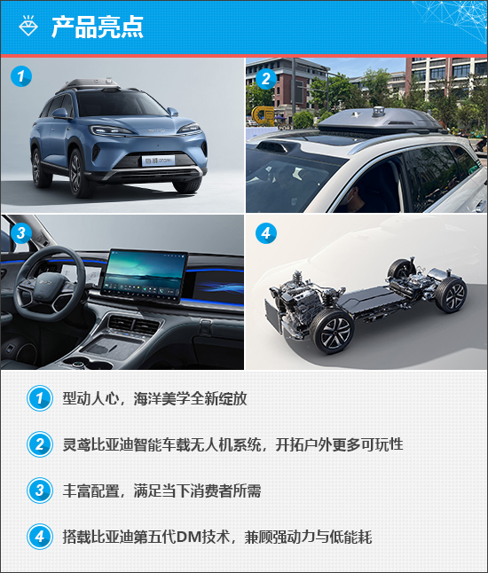 值得一提的是,新车全系均可选装比亚迪灵鸢智能车载无人机系统。由比亚迪和大疆合作研发,拥有动态起降、随动跟拍、地空双摄、收纳快充和一键大片五大核心功能,为消费者开拓户外更多可玩性。
