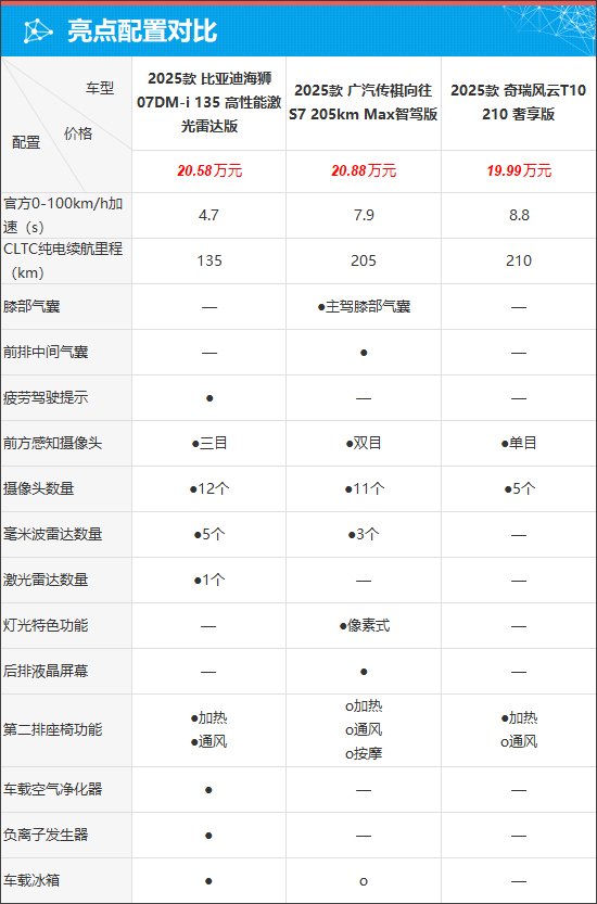 具体到车辆配置层面,我们挑选了售价尽可能相近的车型。通过对比来看,比亚迪海狮07DM-i与广汽传祺向往S7侧重点有所不同。其中,比亚迪海狮07DM-i辅助驾驶硬件较多,并且还独享车载空气净化器、负离子发生器功能,0-100km/h加速时间也是最快的。广汽传祺向往S7则更注重安全性和体验感,独享主驾膝部气囊、前排中间气囊、像素式大灯以及后排液晶屏幕。相比之下,奇瑞风云T10整体表现略有不足。