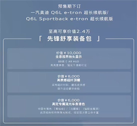下订一汽奥迪Q6L/Sportback e-tron超长续航版,至高可享价值2.4万先锋舒享装备包,包括价值10000元的全息视界抬头显示、价值8000元的高质感超纤顶棚、价值6000元的高定专属流光车身漆色。