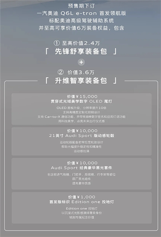 下订一汽奥迪Q6L e-tron首发领航版,标配奥迪高级驾驶辅助系统并至高可享价值6万装备权益,包含先锋舒享装备包以及升维智享装备包。