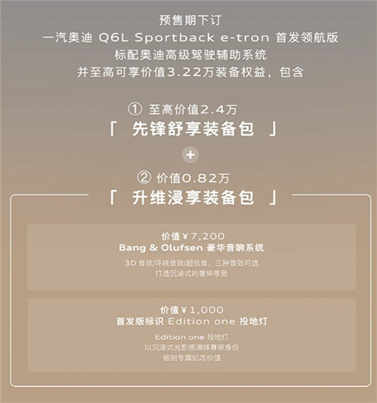 下订一汽奥迪Q6L Sportback e-tron首发领航版,同样标配奥迪高级驾驶辅助系统并至高可享价值3.22万装备权益,包含先锋舒享装备包以及升维浸享装备包。