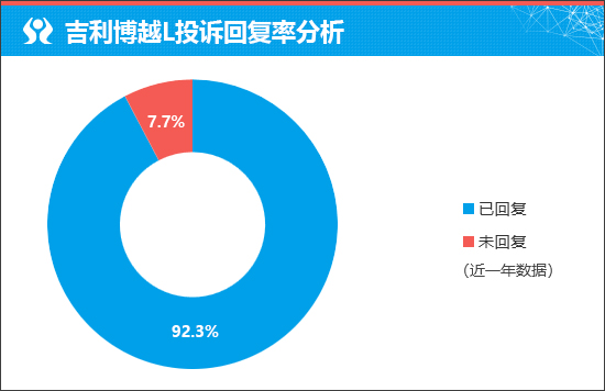 在衡量新车售后服务口碑方面,我们将通过企业对于车主投诉的回复情况进行分析,相对客观地对于新车未来的售后服务口碑有所预判。据车质网数据显示,近一年吉利博越L车型投诉回复率为92.3%,可见厂家对于车主的诉求重视程度还有待提升。