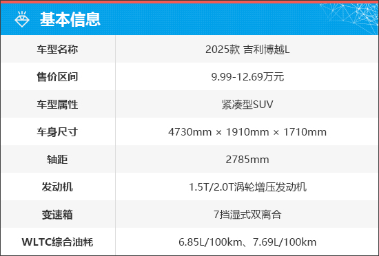 新款吉利博越L共推出5款车型,指导价区间为9.99-12.69万元,上市限时价9.29-11.99万元。同时,厂家还提供了三好现金礼、三好升舱礼、三好焕新礼等购车政策(详情请咨询当地经销商)。