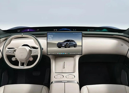 内饰部分,小米YU7采用环抱式座舱布局,整体风格与小米SU7接近,采用悬浮式中控屏和小米天际屏全景显示系统,其由三块Mini LED屏幕组成,通过全景曲面投影技术,反射在前风挡下侧区域。在转向时,盲区的影像可以在小米天际屏优先显示。全新三辐式方向盘,上下均为平底式造型,并在上方设计有回正标识,下侧提供驾驶模式选择等功能。新车采用怀挡式换挡机构,悬浮式中控屏左上角显示有挡位和续航里程等信息。