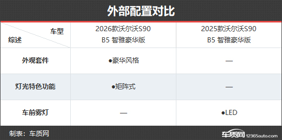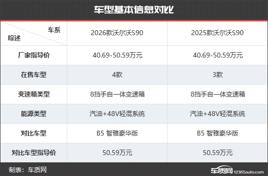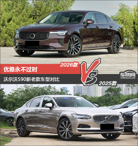 2026款沃尔沃S90共推出4款配置车型,售价区间为40.69-50.59万元。2025款沃尔沃S90仅有3款配置可选,目前均已处于停产在售阶段,虽然车型数量少了1款,但是其售价区间与2026款车型保持一致。本次选择的对比车型均为顶配版本,以便能够更加直观地看出新老款车型在配置层面的具体差异。