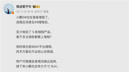 据博主介绍,小鹏G6增程版的进度“应该在X9增程版之后”,小鹏至少规划了5款增程产品,且基于800V平台打造,技术方面“也不必担心会倒退”。
