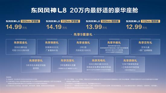 风神 L8 此次预售共推出 4 款车型,覆盖不同续航需求,价格从12.99 万起,还有9重豪礼,质价比拉满。预售活动时间为 2025 年 8 月 11 日至 8 月 28 日,通过风神 APP 或微信小程序下订即可锁定权益,进一步放大 “质价比” 优势。