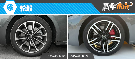 2026款一汽奥迪A5L中低配车型提供18英寸双五辐式轮毂,匹配规格为235/45 R18的轮胎。顶配车型换装19英寸轮毂,匹配规格245/40 R19的轮胎。此外,全系均提供20英寸轮毂可供选装,匹配245/35 R20规格的轮胎。