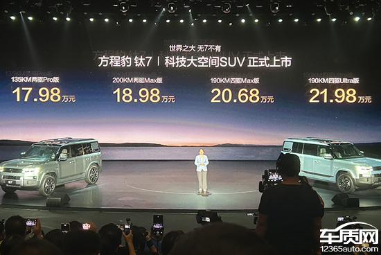 9月9日,方程豹钛7正式上市,新车共推出4款车型,售价17.98-21.98万元。同时,官方还推出包括钛享升舱礼、钛享交付礼、钛享科技礼、钛享金融礼、钛享生态礼、钛享置换礼、钛享用车礼在内的多项购车权益,最高总价值超3.6万元。