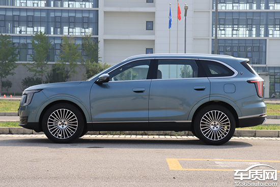 车身侧面,新车采用标准SUV车身结构,车门边框以镀铬饰条点缀,前后翼子板略微外扩,结合车身同色轮眉,展现出饱满的车身姿态。轮毂为密条辐设计,并提供19英寸与20英寸两种规格选择。