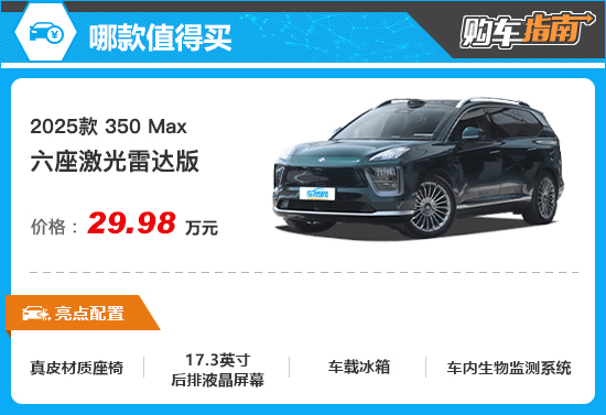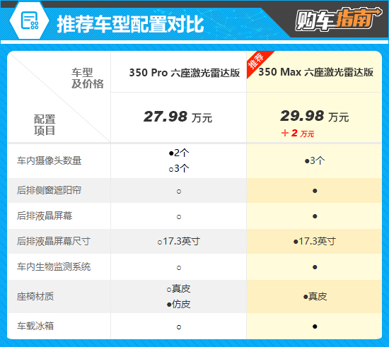 指导价为29.98万元的350Max六座激光雷达版是本次的推荐车型。首先从座椅布局来看,6座版车型第二排为独立座椅,中间过道也更便于进出第三排,空间利用率更好。其次,通过配置对比可以看出,推荐车型相比350Pro六座激光雷达版,座椅升级为了真皮材质,触感更佳,并且还增加了17.3英寸后排液晶屏幕以及车载冰箱,进一步提升用车体验。值得一提的是,推荐车型还配有车内生物监测系统,可以有效避免被“遗忘”的儿童、宠物因遗留车内而带来的危险发生,而售价仅增加了20000元,绝对物有所值。