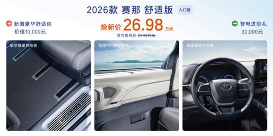 针对家用MPV用户的核心诉求,2026款赛那以26.98万元起售,更推出33.98万元的四驱臻享版。