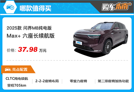 综上所述,对于2025款问界M8纯电版,售价37.98万元的六座长续航版性价比相对更高,在购买时可以优先考虑。