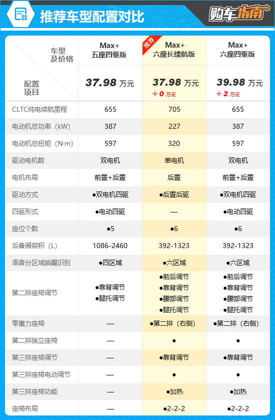 六座四驱版售价39.98万元,相较推荐车型贵了2万元。即便不考虑差价,单纯以减少续航里程为代价,换取动力更强的双电机四驱系统,我个人认为这也并不是一笔划算的买卖。