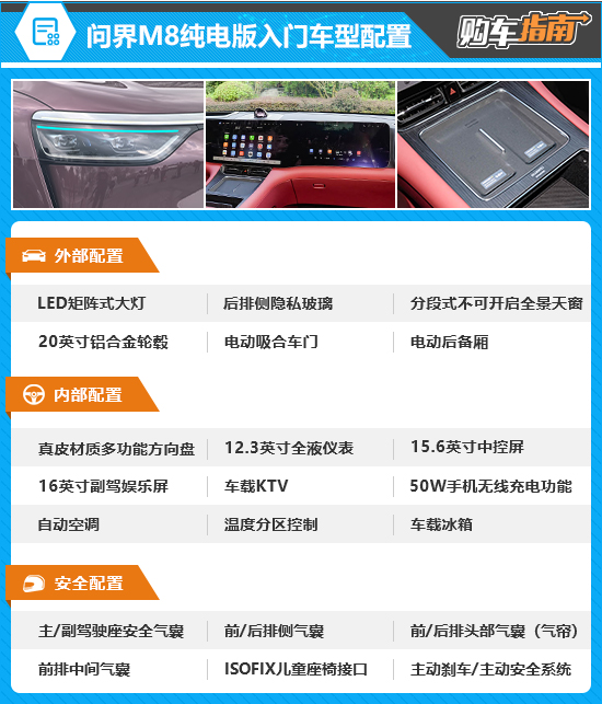 问界M8纯电版的入门车型为五座长续航版,售价35.98万元。客观来说,根据配置表现及性价比来看,其并不存在明显硬伤,丰富的基础配置完全能够满足日常使用所需。此外,包括华为乾崑智驾ADS 4以及HarmonyOS 4智能座舱也均为全系标配,展现出了极强的综合竞争力。之所以不做推荐,主要还是因为对于一款大型SUV来说,常规的5座布局吸引力本就不强,加之部分后排座椅舒适性配置的缺失,确实十分令人遗憾。