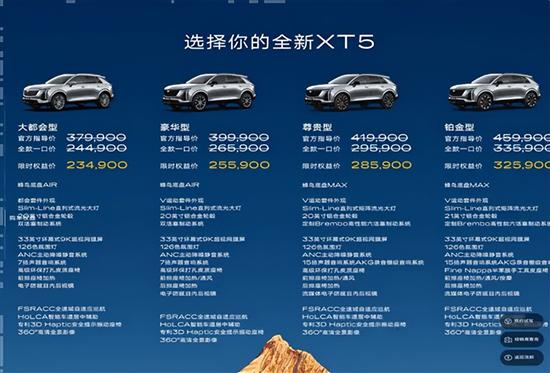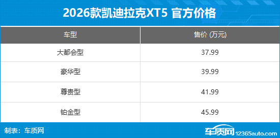 9月23日,2026款凯迪拉克XT5正式上市,新车推出4款配置,售价区间37.99-45.99万元,限时权益价23.49-32.59万元。作为年度改款车型,主要针对配置层面以及配色方面进行调整。
