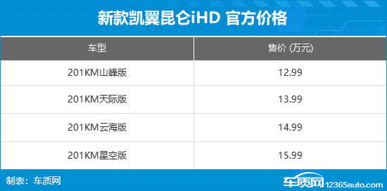 9月25日,新款凯翼昆仑iHD正式上市,新车推出4款车型,售价区间12.99-15.99万元。作为年度改款车型,新车针对配置进行调整,其他变化不大。