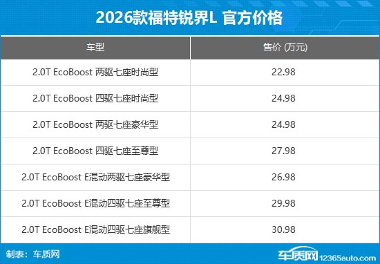 内饰部分,新车同样基本延续了在售车型的设计风格,配备12.3英寸全液晶仪表+27英寸大连屏,内置SYNC+2.0智行互联系统,带来更流畅、智能的交互体验。值得一提的是,新车还全系标配L2级福特Co-Pilot 360智行驾驶辅助系统,涵盖ACC全速域自适应巡航、LC车道居中辅助和AEB主动刹车等多项实用功能。