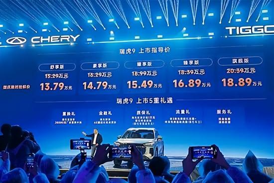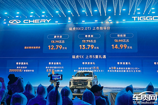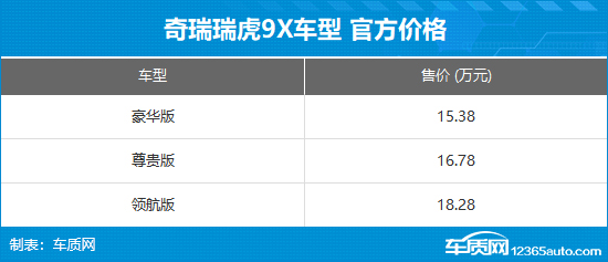 9月27日,奇瑞瑞虎9X正式上市,共推出3款车型,售价区间14.79-16.99万元,国庆假期抢鲜价12.79-14.99万元。现在购车还可以享受包括尊享置换礼(购车至高享20000元,厂家置换补贴)、尊享金融礼(购车享价值8000元,8万元36期0息)、尊享质保礼(购车即享价值1万元,首任非营运车主整车终身质保)、尊享流量礼(享3年2G/月免费娱乐流量,首任车主终身免费基础流量)和尊享服务礼(免费道路救援)在内的5重礼遇。