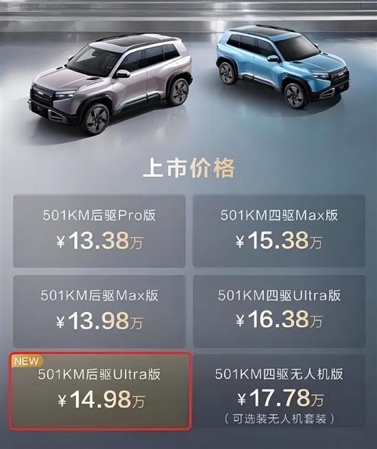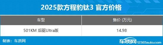 9月28日,方程豹钛3新增501KM后驱Ultra版正式上市,售价为14.98万元。新车新增了微光粉和冰晶蓝车漆色可供消费者选择。