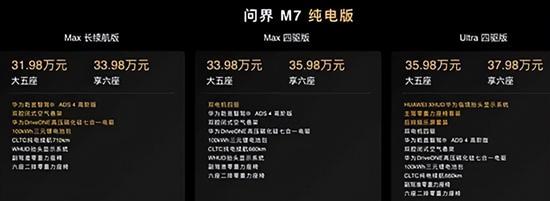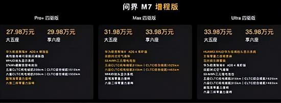 动力方面,全新问界M7提供纯电动和增程式两种配置选择。其中,纯电版车型搭载华为DriveONE高压碳化硅七合一电驱,分为单电机和双电机两个版本,匹配三元锂电池组,根据配置不同,CLTC纯电续航里程分别为660km和710km。增程版车型搭载1.5T发动机,最大功率118kW,CLTC纯电续航里程为315km。