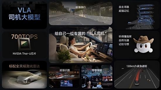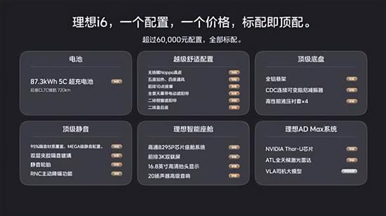 辅助驾驶方面,理想i6搭载理想AD Max辅助驾驶系统,标配ATL全天候激光雷达和英伟达Thor-U芯片,算力达700TOPS,终身免费支持VLA司机大模型。