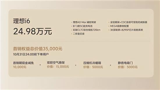 官方宣布,即日起,理想i6可以通过理想汽车官网或理想汽车App进行订购。2025年10月31日24:00前确认订购的理想i6用户,将享受10,000元的现金减免权益,以及双腔魔毯空气悬架、智能冷暖双用冰箱、全车静音电吸门的免费赠送权益,限时首销权益可与其他权益叠加使用。