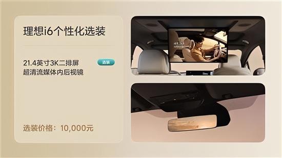 此外,理想i6还提供了诸多选装配置,包括21.4英寸3K二排屏、超清流媒体内后视镜(选装价格10000元);8.8L且支持0-7℃制冷,35-50℃制热的压缩机冷暖箱(选装价格5000元)。