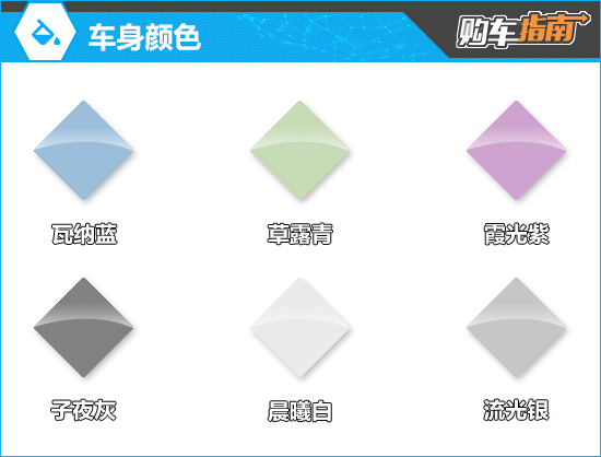 新车提供瓦纳蓝、草露青、霞光紫、子夜灰、晨曦白和流光银,共计6种车身颜色可选,能够满足消费者的个性化需求。官网显示瓦纳蓝、草露青和霞光紫限时免费赠送,选装价格为2000元。