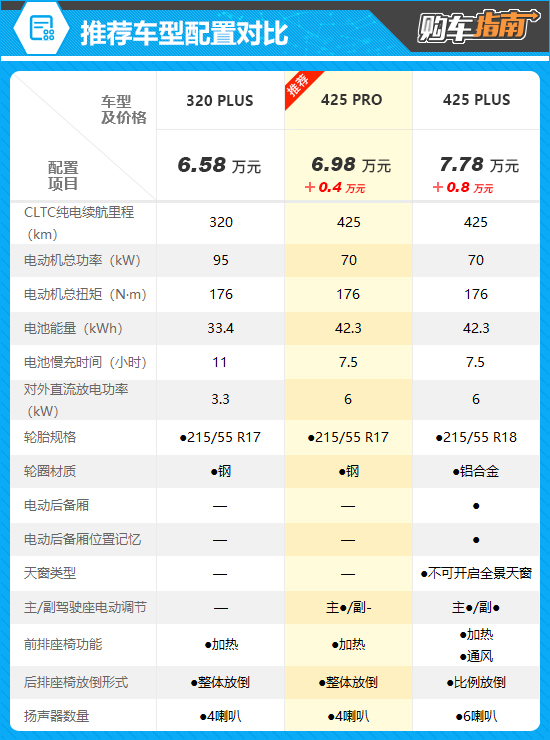 推荐车型是售价为6.98万元的425 PRO,相较低一个配置车型贵了4000元。虽然配置提升并不明显,值得称道的不过只有主驾驶座电动调节以及提升至6kW的对外直流放电,但是425km的CLTC纯电续航里程确实非常“香”,可以有效缓解日常使用过程中的里程焦虑。除了换装能量更大的电池组,功率调低的电动机也起到了关键作用。客观来说,对于这种入门级纯电动小型车,绝大部分消费者也不会过分追求动力参数,因此将其作为换取续航里程的“牺牲品”,我认为完全可以接受。