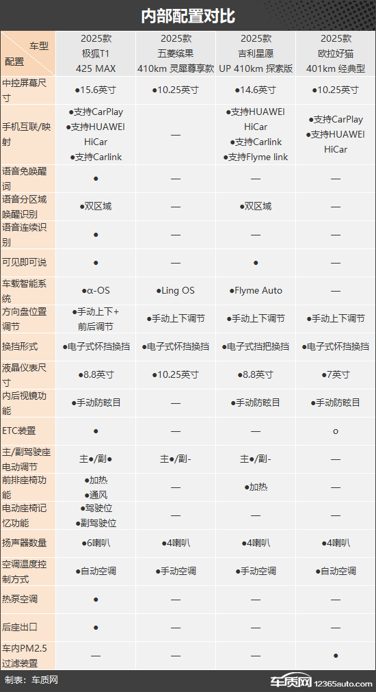 内部配置环节,除了五菱缤果略微有些掉队外,其它三款车型当真是“卷”得不亦乐乎。对比来看,还是极狐T1的整体表现更好一些,不仅中控屏尺寸更大,而且还独享了不少配置,包括语音免唤醒词、语音连续识别、热泵空调以及后座出风口。当然,即便是配置单最不亮眼的五菱缤果,也称得上是物有所值,基本能够满足日常使用。