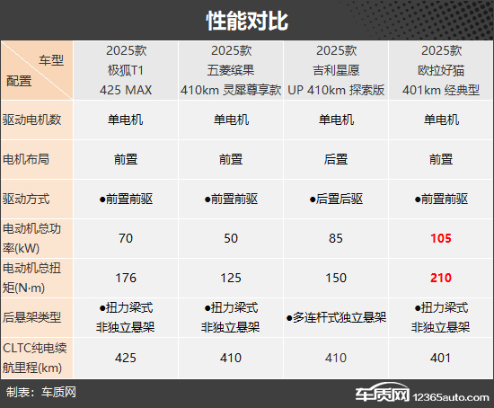 动力方面,四款车型均搭载单电机驱动系统。其中,只有吉利星愿的电动机采用后置布局,其余三款车型均为前置布局。对比来看,欧拉好猫的动力参数最为亮眼,不过其CLTC纯电续航里程排名垫底。这点表现最好的是极狐T1,CLTC纯电续航里程为425km。客观来说,四款车型的续航能力差距并不大。